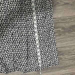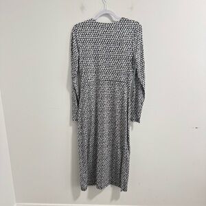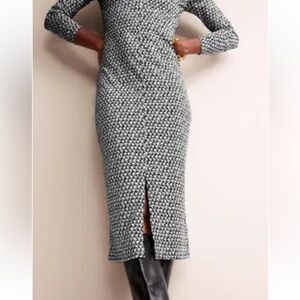 Stylish black and white patterned midi dress. Features a front slit and long sleeves. Perfect for any occasion. Soft Jersey Stretchy Materials.