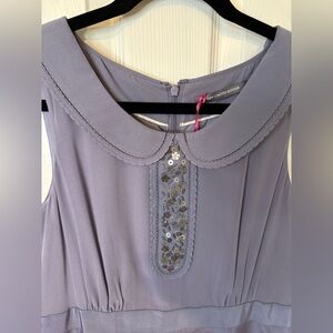 Whimsy meets sophistication in this limited edition silk sheath dress from beloved British brand Boden, known for its classic silhouettes with a playful twist. In a frosted grey-lavender hue, this sleeveless dress features an elegant Peter Pan collar and a delicate floral sequined detail at the bust for a soft, feminine finish.