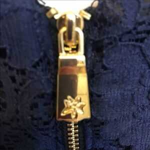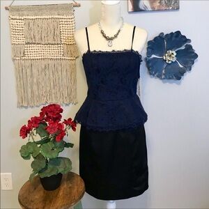 Sexy little lingerie inspired, body con dress designed by Kate Young for Target. Spaghetti straps lead down to a blue lace peplum bodice with ruffled hem. The skirt is a curve hugging, satiny black material. The back has an exposed gold zipper with Kate Young’s signature star emblem. It has loops for a belt, but there wasn’t one attached when I purchased it 🤷🏼♀️