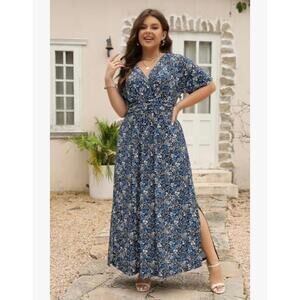 Maxi Dress, Floral Dress, Plus Size, Blue Dress, Summer Dress, Spring Dress, Casual Dress, Dress With Slit, Short Sleeve Dress, V-Neck Dress, Empire Waist Dress, Casual, Vacation, Brunch, Day Out, Party, Evening Event, Travel, Bohemian, Cottagecore, Romantic, Feminine, Chic