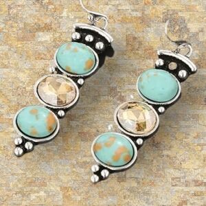 Turquoise stone with a gold toned crystal, silver plated silver.
