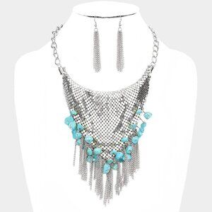 NWT Boho Turquoise Stone Silver Metal Mesh Scarf Fringe Necklace Set