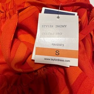 Eye-catching dress with a vibrant red and orange pattern. Ideal for lively occasions.