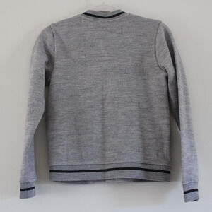 New with tags! Bonpoint Boys gray wool blend cardigan bomber jacket. Snap front closure. Cute and impeccable knit. Crest logo on chest. Varsity style stripes. Size 12. Originally $430