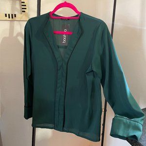 Beautiful green blouse with black piping detail. Long sleeve with some sheer and buttons on sleeves.