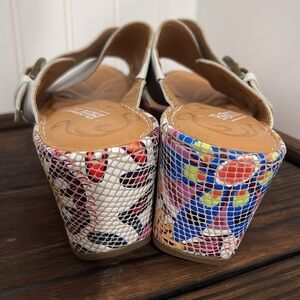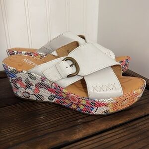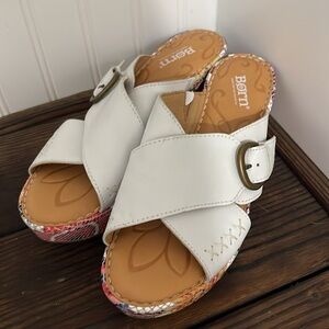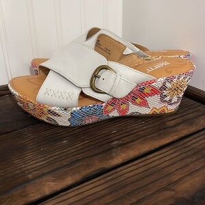 New no box. Elevate your shoe game with these stunning Born Curstyn platform wedge mules. The white leather sandals feature a beautiful floral mosaic design, perfect for the summer season. The slip-on style and high heel (3-3.9 in) make them a comfortable and stylish choice for any occasion. These sandals are perfect for women who love fashion and comfort. The leather upper material ensures durability and the M shoe width allows for a comfortable fit. The Born brand is known for its quality and these sandals are no exception. Add these stylish mules to your shoe collection today! Women’s size 9