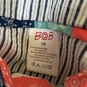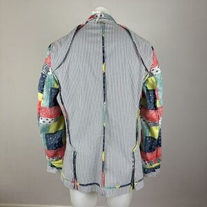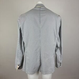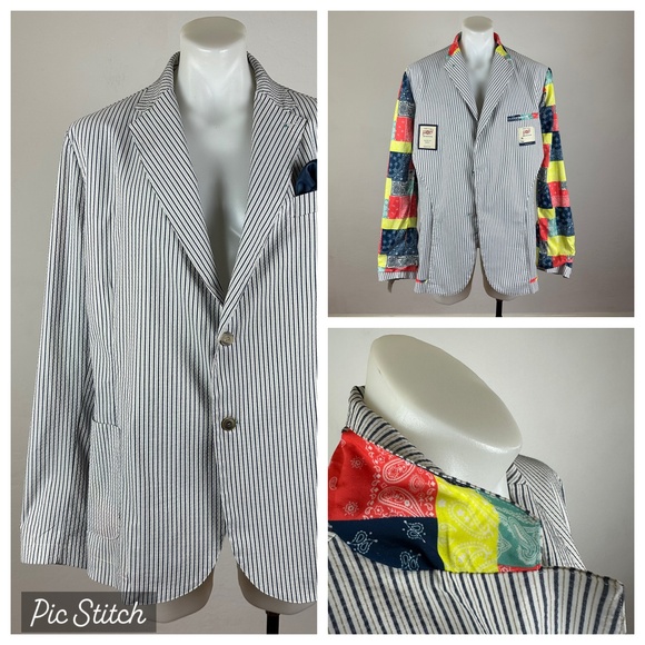 Stand out with this unique Born to Be BOB blazer. It features alternating navy and tan stripes against a white field, and looks fantastic in person. It can be dressed up formally, or dressed down as a casual sport coat over jeans and a t-shirt. The lightweight, almost seersucker construction feels great for all day wear.