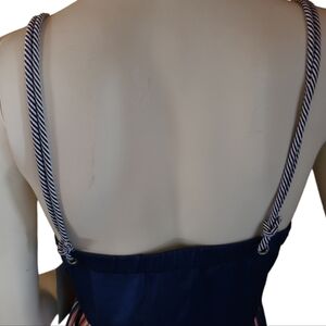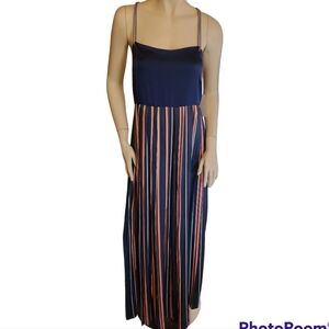 NWT Boston Proper maxi dress. Navy blue with orange and white stripes. Empire waist. Soft pleating with rope-style spaghetti straps.w Side zipper. Approximately 18" pit to pit, 60" from top of straps to hem.