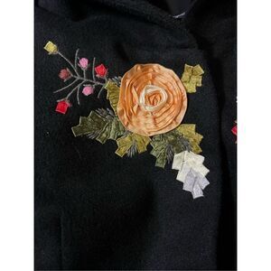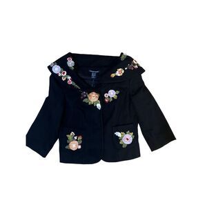 This is an absolutely adorable short cotton blend jacket from Boston proper brand new with tags. This is marked an 8 but. It is tiny, more like a two or four. It barely buttons on my size 6 mannequin. It is embellished with beautiful embroidery and appliqué of bright floral. It has a large shawl collar and tiny pockets with a snap front closure. Fully lined.