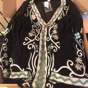 Sheer with heavy beading, beautiful material with so much detail! XXS but fits up to a medium depending on how lose you'd like it. Brand new, just tried it on!