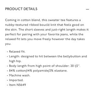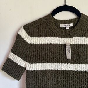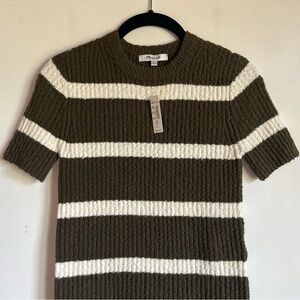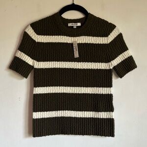 New with tag Boucle Knit Crewneck Sweater Tee in Olive Green Stripe (lighter green than shown most accurate in materials tag photo). Size XXS very stretchy could also fit XS/S (check measurements). Short sleeve pullover crew neck slightly cropped sweater in a super soft bouclé knit fabric. Excellent overall condition, a little bit of makeup on the front near collar from store try-on. Was $68 retail now $78 on the website but sold out in this colorway. Style NS649
