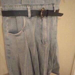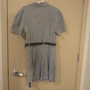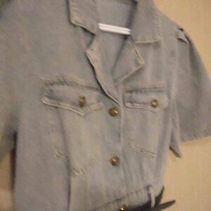 Brand new denim dress with metal buttons on the front. Comes with a black belt. Short sleeves. Faded denim look. Size not printed, but fits like a small/medium.