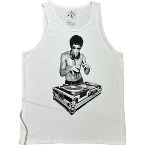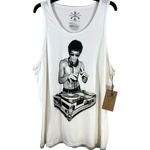 New with tags Bruce Lee DJing Avengers Age Ultron Robert Downey Jr Iron Man Tanktop Women’s White shirt size extra large.