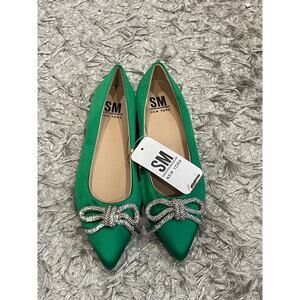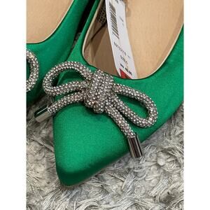 Bow Ballerina Flats in a green satin material with a rhinestone-embellished bow on the toe.