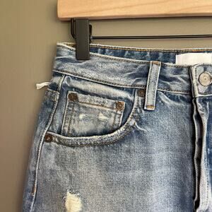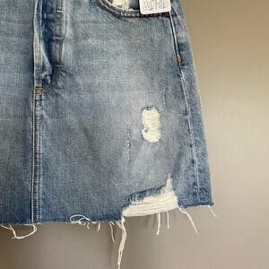 New with tags Free People Boyish The Corey High Rise Rigid Denim Skirt in Dr. Strangelove, Size 26, Light Blue Wash, Distressed, Cutoff, Raw Hem, Jean Skirt, Denim Skirt