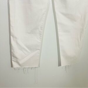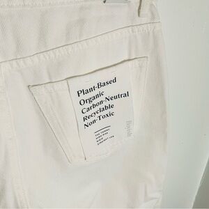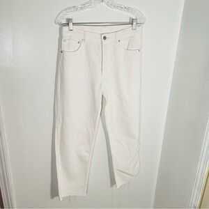 Color & Detail: White denim; high-rise waist; straight leg; clean finish, no distressing.