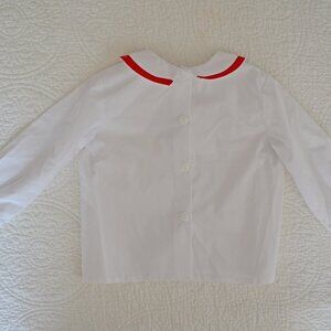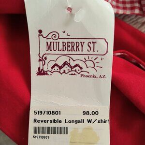 NWT Boys' reversible Mulberry St. longalls with white dress shirt, tag size 24. One side is red with appliqued dog catching frisbee, the other is red and white gingham with Christmas stocking. Snaps at legs and functioning buttons at shoulder. In great condition.