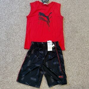 Vibrant red tank top with iconic Puma logo. Black shorts with subtle branding. Ideal for sports and casual wear. New with tags