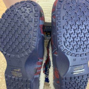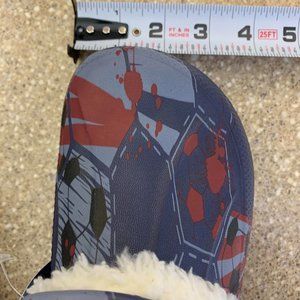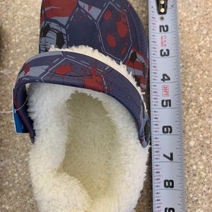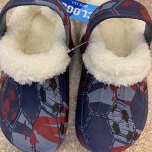 Little toes stay warm and cozy in clogs with sherpa lining in this sporty fun soccer print in navy blue & red