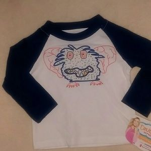 Hi you are shopping for a absolutely adorable baby boys truly scrumptious By Heidi Klum long sleeve graphic tee shirt size 12 months. It is brand new with tags and comes from a smoke/pet free home. White with navy blue sleeves and trim around neckline. Has an blue and orange crazy monster in front of chest. 100% cotton.Super cute comfortable. Great fall winter and chilly spring night top.