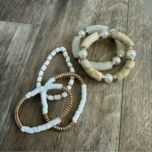 NWT! Stylish bracelet set featuring white and gold beads. Perfect for accessorizing any outfit.