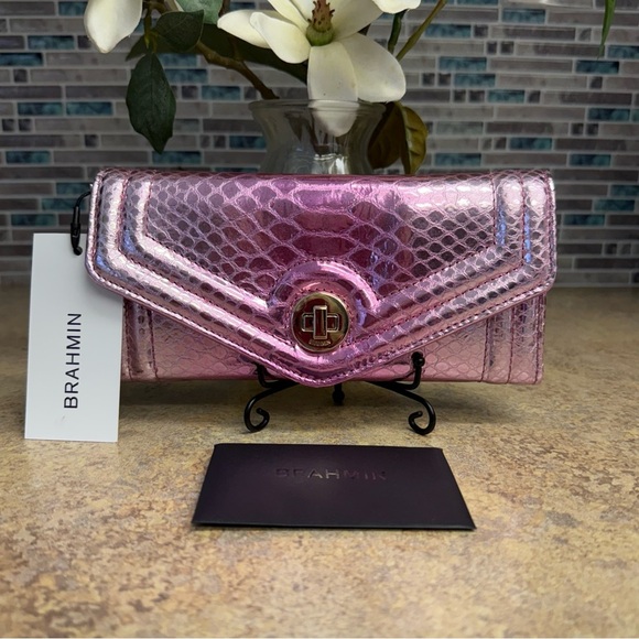 New with tags Brahmin Veronica wallet featured in Rose Water Akoni, a beautiful pink snake texture with turn lock closure.