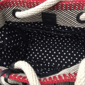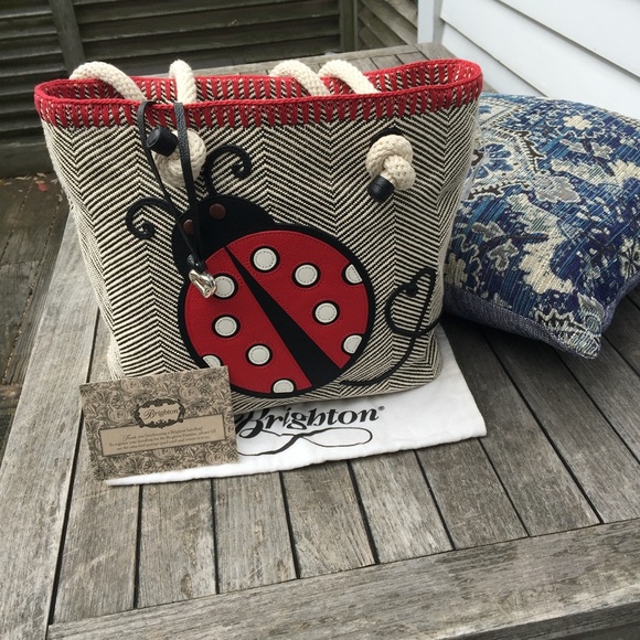 Brighton Dotty Ladybug Tote one of the cutest bags ever! Great for summer, the beach, vacations etc. This is a new bag never used as you can tell i am the consumate buyer. The bag has magnetic closure approx 12" high 13.5" wide 5" deep and 10.5" drop woven black and off white with leather ladybug on front Comes from smoke free home