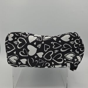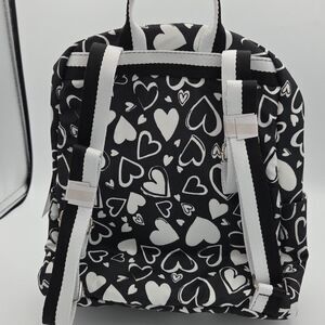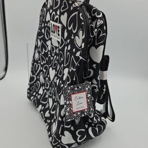 The NWT Brighton Limited Edition Hearts A Flutter Endless Love Backpack is a medium-sized backpack featuring a black nylon exterior with a pattern of hearts. It has a zip closure, top handle in black nylon, adjustable strap drop, and hardware in black. The bag has a nylon lining and a depth of 4 inches. This stylish backpack is perfect for women who love a romantic theme, with a retail price of $150.