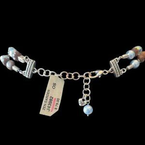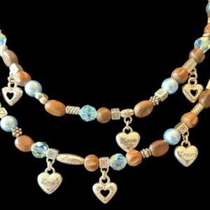 Two-tiered strand Zen Garden necklace with silver heart charms, blue glass pearl and crystal beads and silver and brown wood beads. Adjustable – approx. 16.5” – 18”. New with tags!