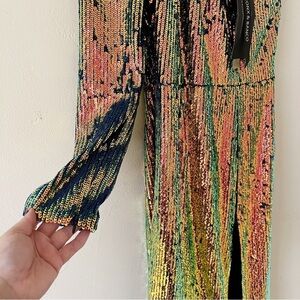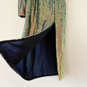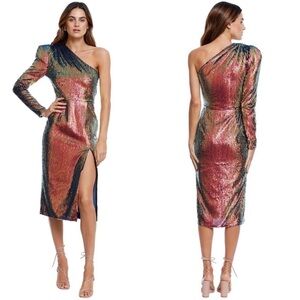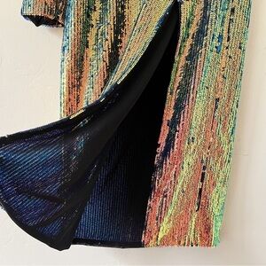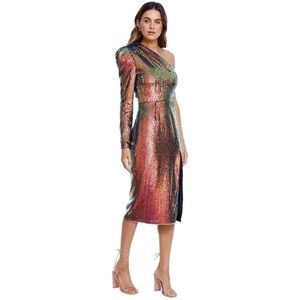 Get party-ready in the Galaxy Midi Dress by Bronx and Banco! Done in an all-over multicolour sequin print with strong, padded shoulders and a side seam split. Hire this dress to look incredible at your next cocktail event.