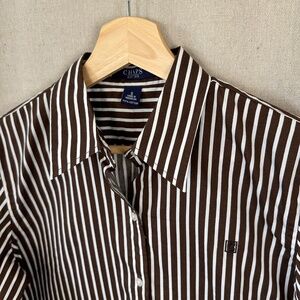 Elevate your classic style with this timeless Chaps by Ralph Lauren women’s button-down shirt. Featuring bold brown and white vertical stripes, this shirt blends equestrian elegance with preppy sophistication. Made from high-quality cotton for breathable comfort, it’s perfect for work, riding, or everyday wear.