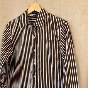 Chaps Ralph Lauren shirt, women’s striped blouse, equestrian top, preppy button down, riding shirt, Chaps women’s top, brown stripe shirt, country club fashion, Ralph Lauren inspired, Chaps collared shirt