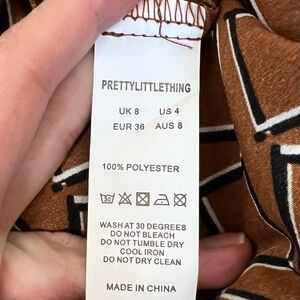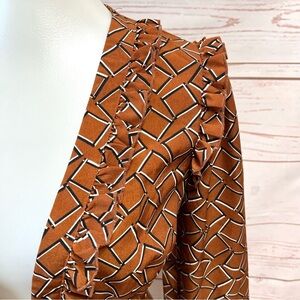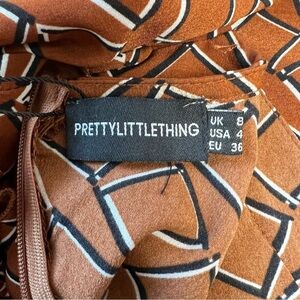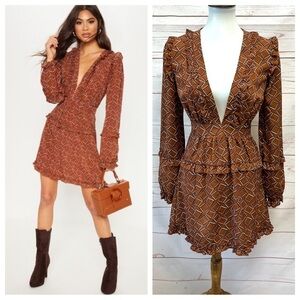Get that perfect daily outfit with this dress. Featuring a brown all over geometric print, ruffle frill puffy sleeve detailing and plunge neckline, team it with statement accessories and strappy heels to complete the look.