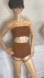 Stylish brown ribbed two-piece set. Includes a strapless top and high-waisted shorts with garter detail. Perfect for a chic look.