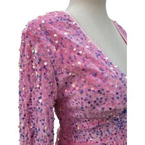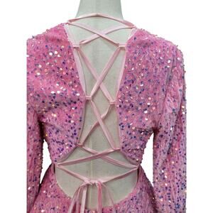 NWT Bubblegum Pink Sequin Short Dress Long Sleeves Open Corset Back