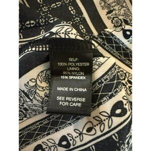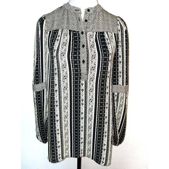 Tags-women's blouse, patterned top, long sleeve shirt, XS blouse, black and white top, polyester blouse, casual shirt, professional blouse, lightweight blouse, button-front top, classic fit blouse, Buckle Black clothing, stylish women's shirt, peasant blouse, artsy, boho