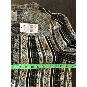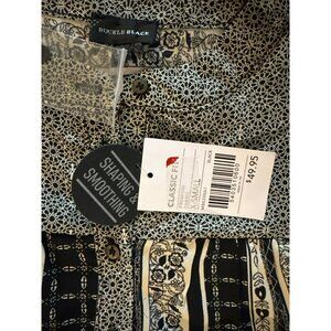 This Buckle Black blouse offers a polished look with its intricate black and white pattern, button accents, and lightweight fabric. The long sleeves and classic cut make it suitable for professional settings or a refined casual outfit.