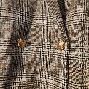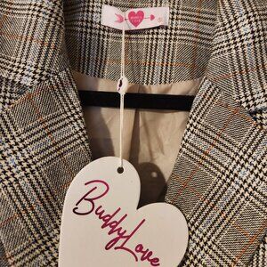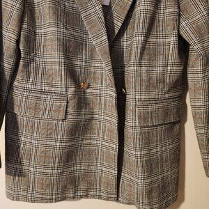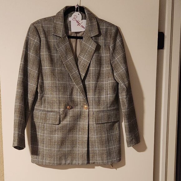 NWT Buddy Love Plaid Double Breasted Oversized Blazer with Gold Button Brown Tan Cream. Size Small. Measurements, 29-inch length, 23.5-inch sleeves. 60% Rayon, 40% Polyester