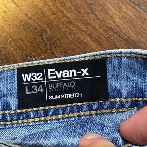 NWT BRAND NEW NEVER WORN SAMPLE Buffalo David Bitton Evan-X Slim Stretch Light Wash Denim Jeans…button fly super soft and comfy denim! Cool accent stitching at right pocket