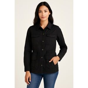 Buffalo David Bitton, black shacket, utility shirt jacket, cotton layer, button front jacket, women’s size small, black cargo jacket