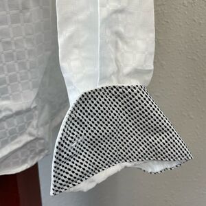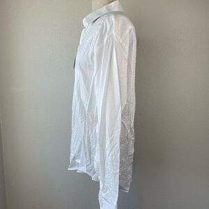Stylish button down shirt measuring 22 inches armpit to armpit laying flat and 29 inches in length from shoulder to hem.