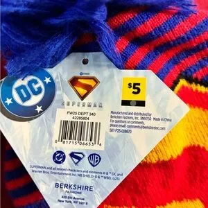 2x DC Superman Beanies: Classic red and blue stripes with the iconic "S" shield patch and "SUPERMAN" embroidered on the royal blue cuff.