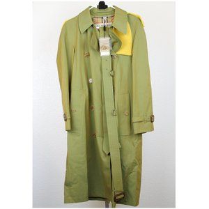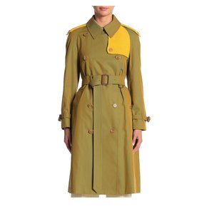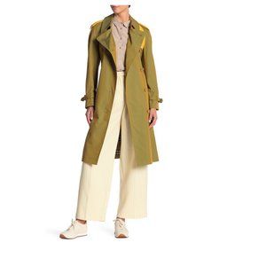 A unique contrasting knit trim offers a chic look into a classic double breasted trench coat.