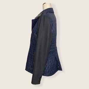 Description: Lightweight navy blue puffer jacket with black sleeves. Interior and bottom of collar has Burberry Classic nova check pattern. Perfect for fall weather.