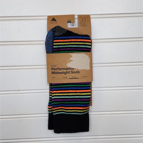 NWT Burton Kids Performance Midweight Merino Wool Socks, size S/M(13-1), color is called Mini Stripe, black with multicolor stripes.