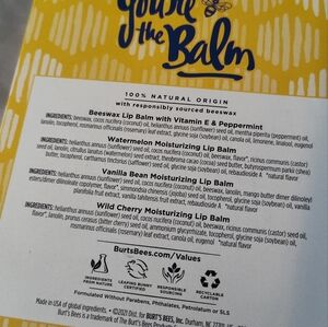 This is new, never opened! This is a 4pk of Burt's Bees Lip Balm Set! The scented lip balms are: beeswax, watermelon, vanilla bean, and wild cherry!