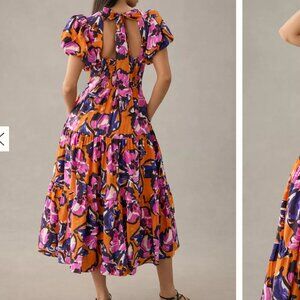 Brand new with tags (NWT) Anthropologie Puff Sleeve Midi/Maxi Dress in a gorgeous orange and pink floral print. Features flattering puff sleeves, feminine silhouette, and versatile length that can be styled as a midi or maxi depending on height. Perfect for weddings, parties, vacations, or everyday wear.