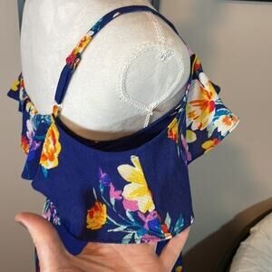 NWT By & By blue floral dress, straps across shoulders, with off shoulder ruffle sleeves from front to back, high low skirt that is fully lined, zip closure in back, Size 1