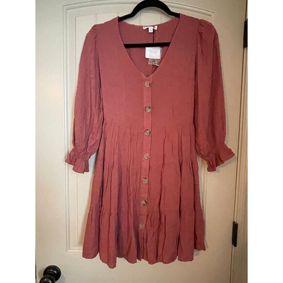 This is an adorable boutique dress (By The River) that has the threaded dots all over it. Larger buttons down the middle. There is a silk underlay to the dress. Size small. 100% rayon lining. 100% polyester. It recommends handwashing. Smoke free home. Fast shipping!