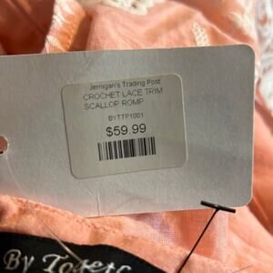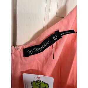 New with tags By Together size large romper. It is rayon with a crocheted lace trim. It is lined. Adjustable straps. Zips in the back. Light salmon color. Measures 18” from armpit to armpit. 15” across the waist. Total length is 33”. So beautiful!